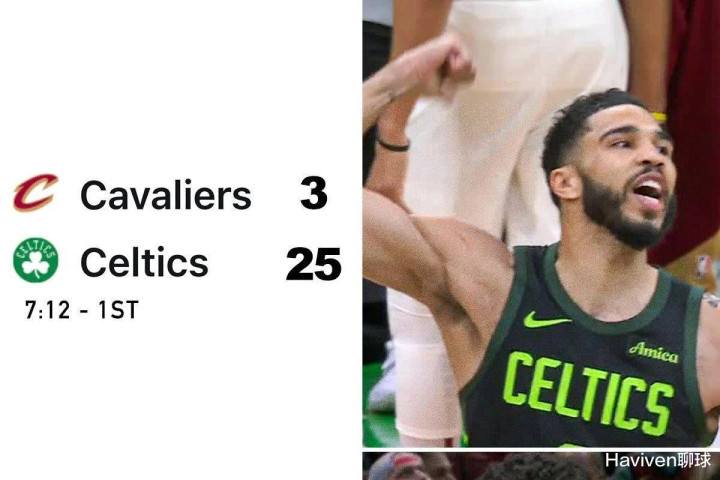 比赛首节打了接近一半时,凯尔特人就得到了25分,而骑士队仅仅拿到了3分。领先22分的原因是,凯尔特人找到了自己熟悉的节奏,外线三分连续进。而骑士队一上来显然没有适应凯尔特人的防守强度,投篮失准。